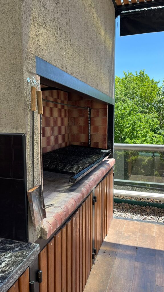 Capacidad para 30 personas. Espacio al aire libre con parrilla y ventiladores, perfecto para eventos informales o asados de equipo.
